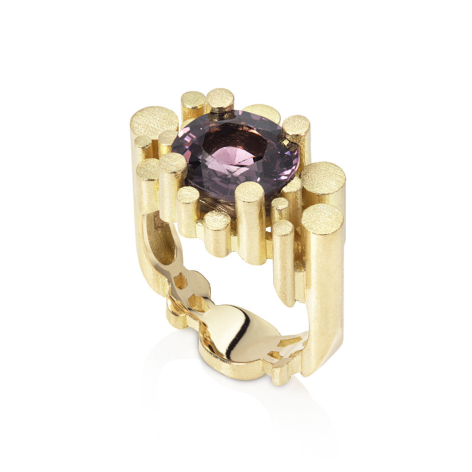 staffa ring formed of undulating columns of 18ct gold and a moody sparkly cushion violet spinel nestled within