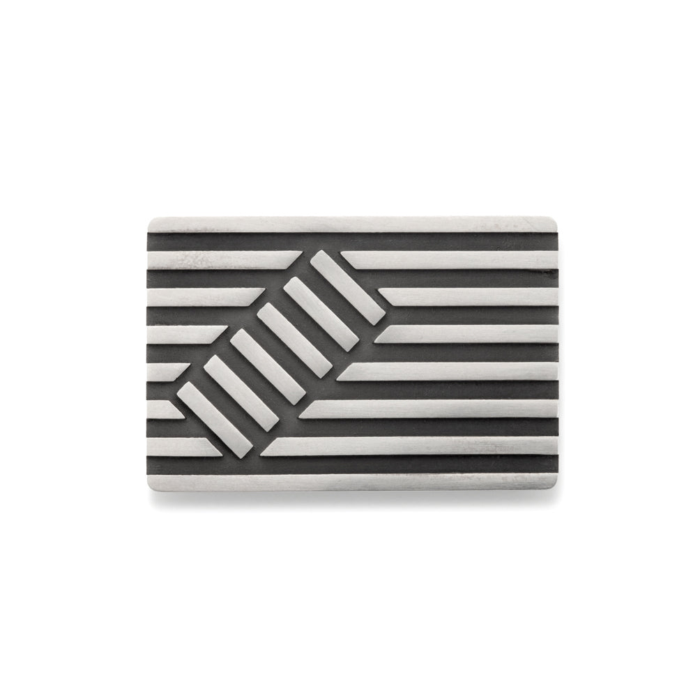 deck chair brooch in silver made of linear construction with an opposing rectangular inset, blackened recesses accentuate the design