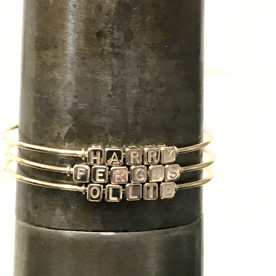 This playful bangle style can be personalised to feature initials or spell out a name or a word with a special meaning to you. You could use personalised names, initials, words or characters for example. Many of my clients choose to spell out their children’s names.