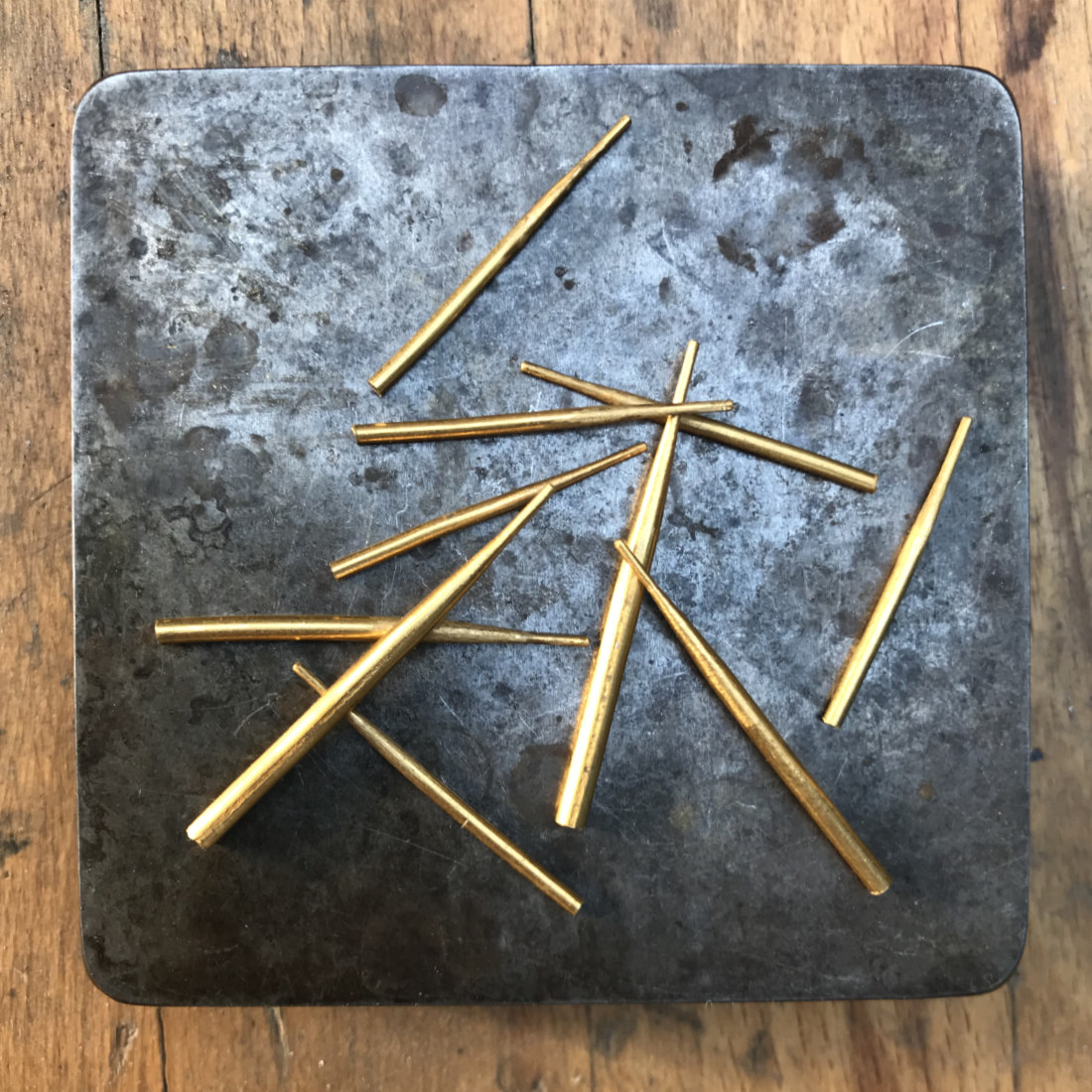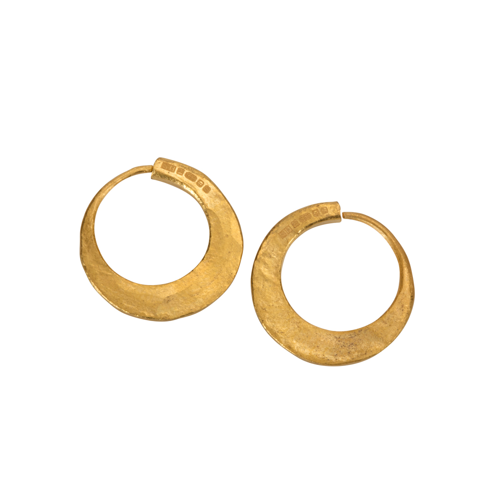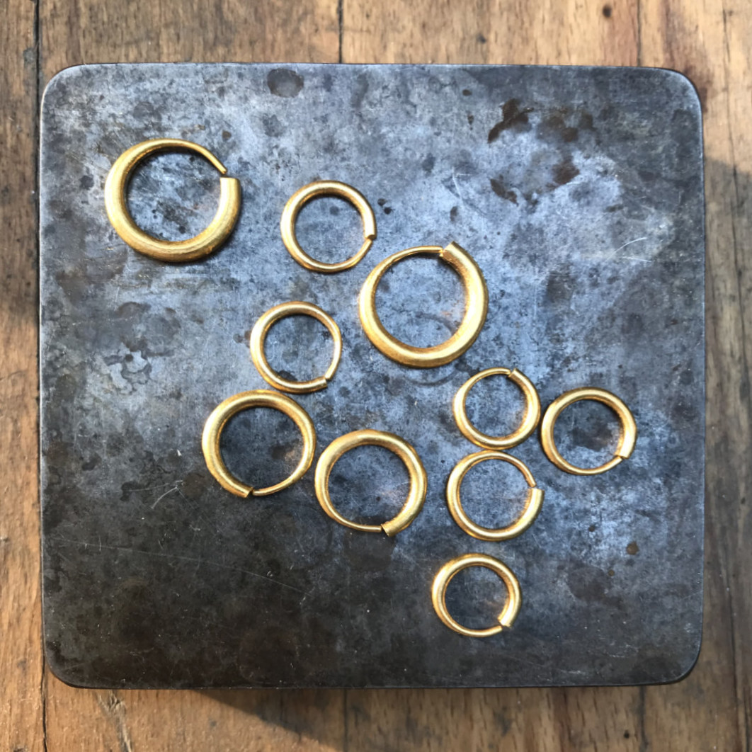 Taking 24ct gold grains (like tiny nuggets) I melt these at high temperature to form an ingot. See video above to see some of the melting process. I then drawn the metal down into the required gauge of wire using steel draw plates. The desired length of wire is cut, and one end is tapered for the thin post that will go through the ear. I then hand forged these into the flattened hoop shape.